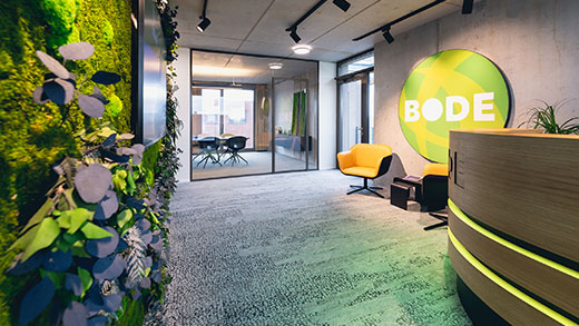 Energieeffizienz und Nachhaltigkeit spielen für Bode eine zentrale Rolle und sollten sich im neuen Bürokonzept widerspiegeln. Eine bereits bestehende vertikale Grünwand im Treppenhaus, die sich über die gesamte Gebäudehöhe erstreckt, wurde zum Vorbild einer Mooswand im Eingangsbereich der neuen Büroräume.