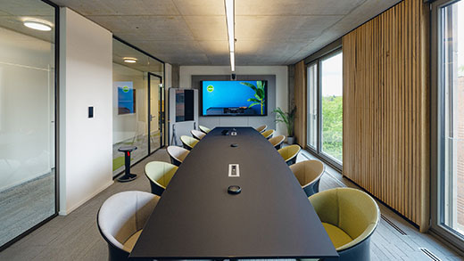 Die Besprechungsräume, die sich auf jeder Etage befinden, wurden sorgfältig geplant, um den unterschiedlichen Anforderungen an Funktionalität und Komfort gerecht zu werden: Gemeinsam mit unserem Netzwerkpartner VAV Medientechnik haben wir die Räume so ausgestattet, dass sie modernste Medientechnik bieten. Diese ermöglicht reibungslose Präsentationen und Videokonferenzen und sorgt für eine nahtlose Integration in den Arbeitsalltag.