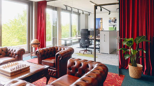 Im dritten Obergeschoss befindet sich nun, durch eine Glaswand vom puristischen Chefbüro abgetrennt, die gewünschte englische Lounge mit klassischen, edlen Stilelementen wie den weichen, dunkel gehaltenen Sesseln.